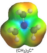 Carbocations are classified according to the number of saturated carbon atoms bonded to the carbon bearing the positive charge. The charge density maps indicate through the blue colour that the positive charge is delocalised to a greater extent on tertiary and secondary carbocations. Thus alkyl groups are better able to delocalise charge than the hydrogens.