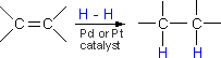 Alkenes react with H2 by addition in the presence of a Pt (platinum) or Pd (palladium) catalyst. This reaction is referred to as hydrogenation.