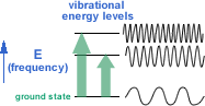 These motions (collectively known as vibrations) have frequencies corresponding to the frequency of light in the infrared region of the electromagnetic spectrum. The available vibrational energy levels for any molecule depend on its structure (see diagram).