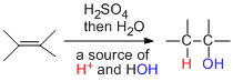 Concentrated sulfuric acid then water: Alkenes react by addition with concentrated sulfuric acid (H2SO4). Adding water to the sulfate product formed gives the alcohol. The H+ activates the double bond toward reaction. This reagent is asymmetric; therefore two alcohols form if the alkene is asymmetric.
