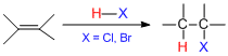 Hydrogen halides:Alkenes react by addition with HX (HCl or HBr) to give monohaloalkanes. As this reagent is asymmetric, two different haloalkanes form if the alkene reactant is asymmetric (one or more groups at doubly bonded carbons are different).