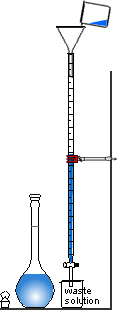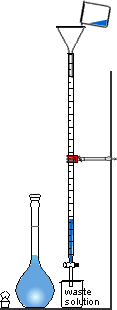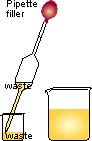 | 1 | Using solution that has been transferred to a small beaker, rinse the burette, letting some solution run out through the tap. Discard waste. | 2 | Fill burette. Open tap and run some solution through the tip. Discard waste | 3 | Using some of the other solution in a small beaker, rinse the pipette. Discard waste. |