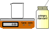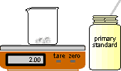 | 1 | Place clean beaker on balance. Tare balance. | 2 | Weigh solid into beaker. Record the exact mass of solid weighed. |