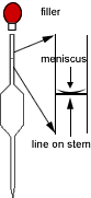 ![]() | Pipettes are used to transfer a fixed volume of liquid (often 10 or 25 ) between containers. SAFETY NOTE:The pipette is filled by suction using a filler. Never suck up the liquid using your mouth!!! One type of filler is a bulb. Be careful NOT to force the bulb onto the pipette stem because the glass can break. Note that pipettes are calibrated so that designated volume is delivered when the pipette is filled so that the bottom of the meniscus is on the line. |