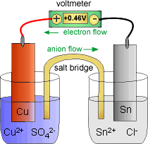 e–If the voltmeter were removed, electrons would flow from tin to copper, and anions would flow in the opposite direction.
