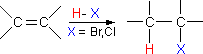 Monohaloalkanes can be prepared by reaction of alkenes with HX (HCl or HBr). This reaction can result in two products if the alkene is not symmetrical (same two groups attached to both doubly bonded carbon atoms).